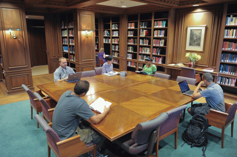 Located on the sixth floor of the university’s main library, the wood-paneled Safire Room is a quiet study space near the Special Collections Research Center.