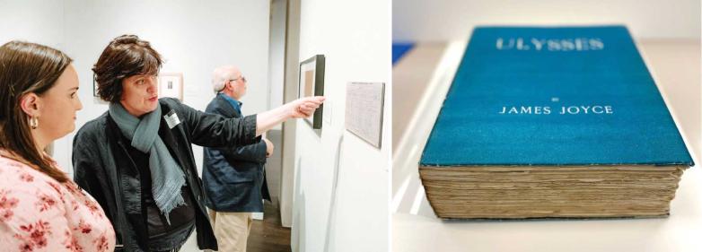 Left: Exhibition curator Clare Hutton (right) with the Vice Counsel Niamh Clarke (left) of the Consulate General of Ireland in Austin, Texas. Right: A first edition of Ulysses, number 17 of 1,000 copies printed in Paris by Shakespeare and Company in 1922.