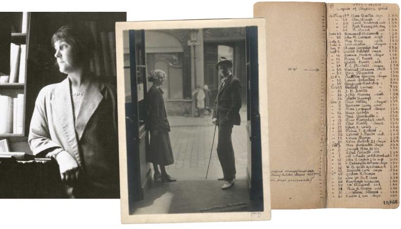 Left: Harriet Shaw Weaver looking out the window of Shakespeare and Company, 1921. Middle: Beach and Joyce in the doorway of Shakespeare and Company, ca. July 1921. Right: The first page of Beach’s subscription list for sales of Ulysses, 1922.