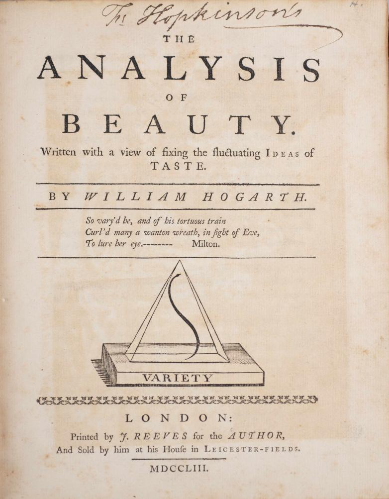 The Analysis of Beauty, William Hogarth, publ. J. Reeves, London, 1753; has two large foldout plates, includes bookplate of Francis Hopkinson (1737-1791). Hopkinson Family Archive. Estimate $400-800