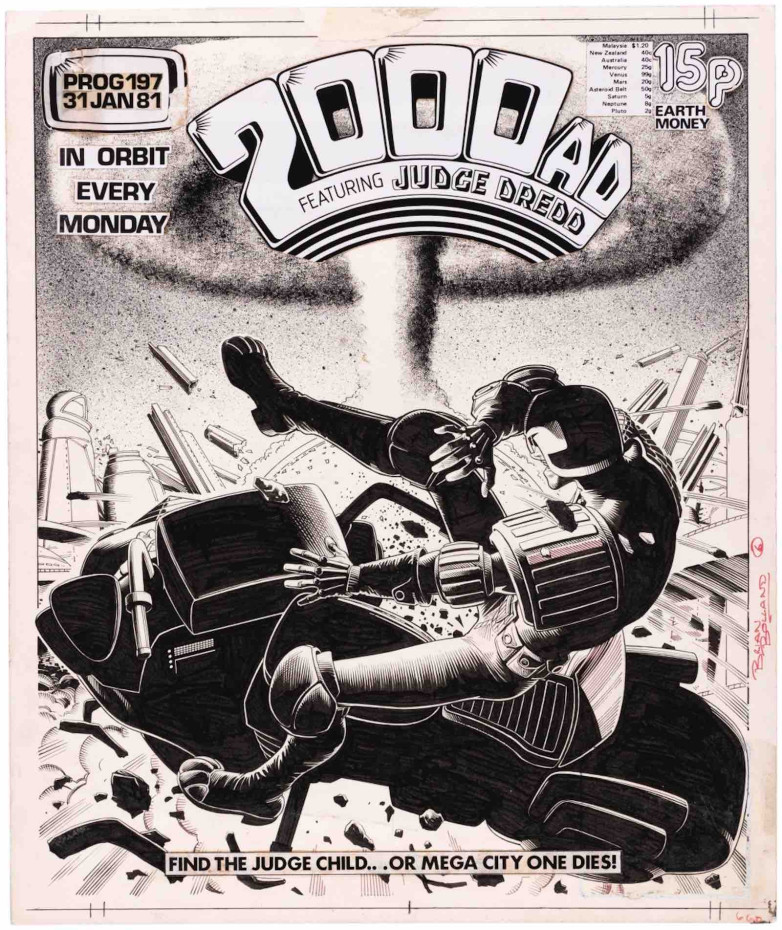 Brian Bolland original pen and ink cover art from an early run of 2000 AD, #197, featuring Judge Dredd