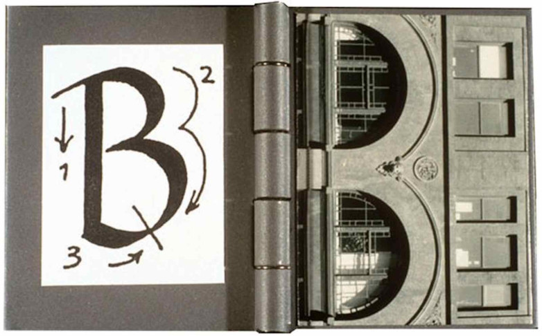MCBA’s Outlook Gallery will also feature a new installation by Wirth, Archabet: An Architectural Abecedarium, a six-foot high drum leaf bound book that presents the cityscape as an alphabet book. It comprises hundreds of digital photographs of building façades taken over 20 years of travel, discovering details and structures that mimic letter forms. Occupying the window of the gallery, it is large enough to invite the viewer into the space of the book. Centered in each spread are Johann Steingruber’s letter-shaped plan drawings of buildings from Architectural Alphabet, published in 1773. The condensed plane of the city is flattened as a sheet of paper, the images and letters read across its surface.