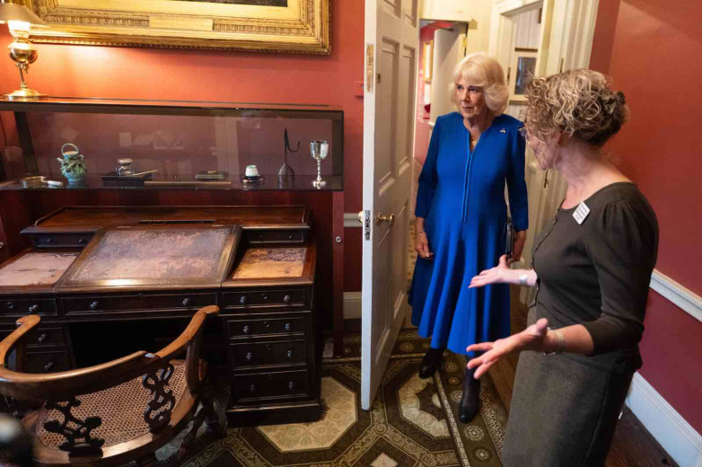 Inside, The Queen saw the desk at which Dickens wrote Great Expectations, A Tale of Two Cities and Our Mutual Friend and met actor and Museum Patron Simon Callow, who gave a reading of the arrival of the ghost of Jacob Marley from A Christmas Carol. In the adjoining Drawing Room, where Dickens often continued to write while his children played, The Queen chatted with actress and Museum Patron Miriam Margolyes, who read, with Simon Callow a selection of letters from Charles Dickens.