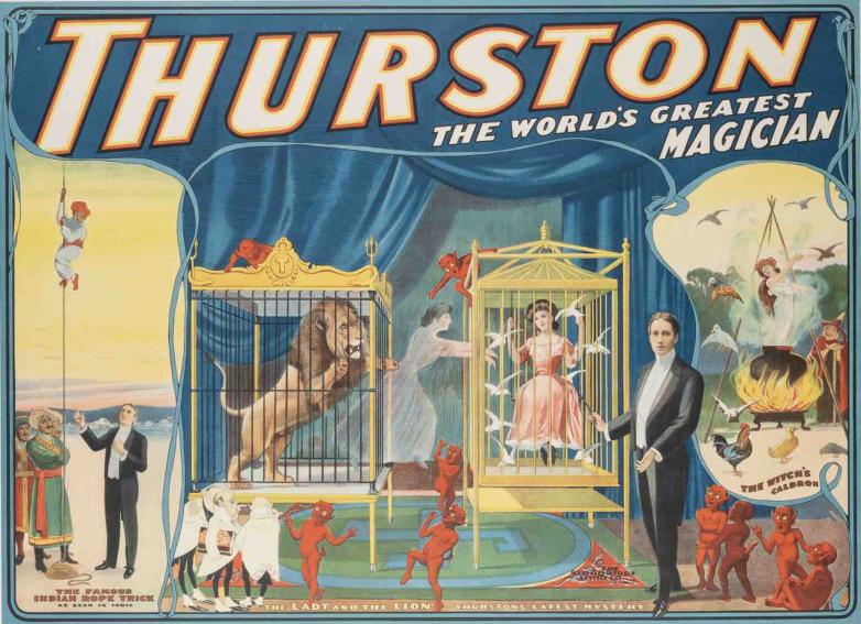 • Lot # 49b, Thurston the World’s Greatest Magician. The Lady and the Lion (estimate: $10,000-15,000) was published in Cincinnati & New York by The Strobridge Litho. Co. in 1909. This one-sheet poster depicts three illusions from early in Thurston’s career. The Native American version of the swastika appears in this poster, as it does in other Thurston posters of the era. This rare example is the first one ever offered by Potter & Potter, and is one of only a handful extant.