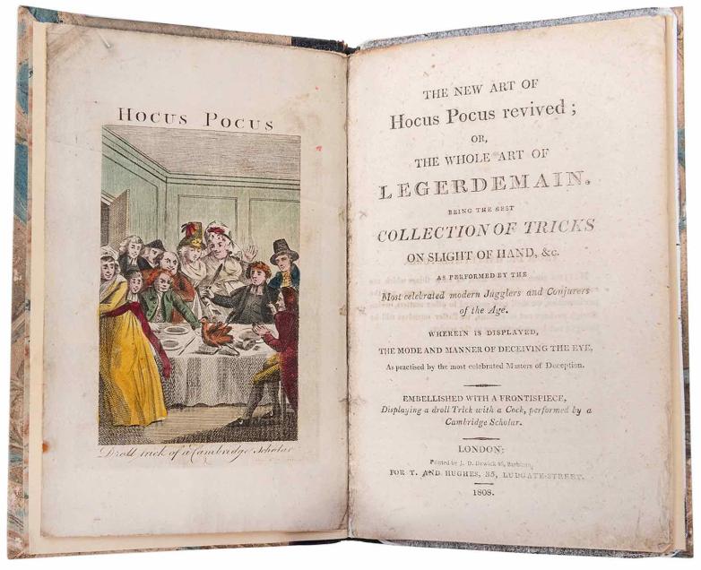 * Lot #187, New Art Of Hocus Pocus Revived, is estimated at $3,000-5,000. It was printed in London by T.D. Dewick 46, Barbican for T. and Hughes, 35, Ludgate-Street in 1808. It features marbled boards over a pebbled black leather spine titled in gilt, with marbled endsheets. Its hand-colored frontispiece depicts the “droll trick of a Cambridge scholar” as also seen in editions of Breslaw’s Last Legacy.
