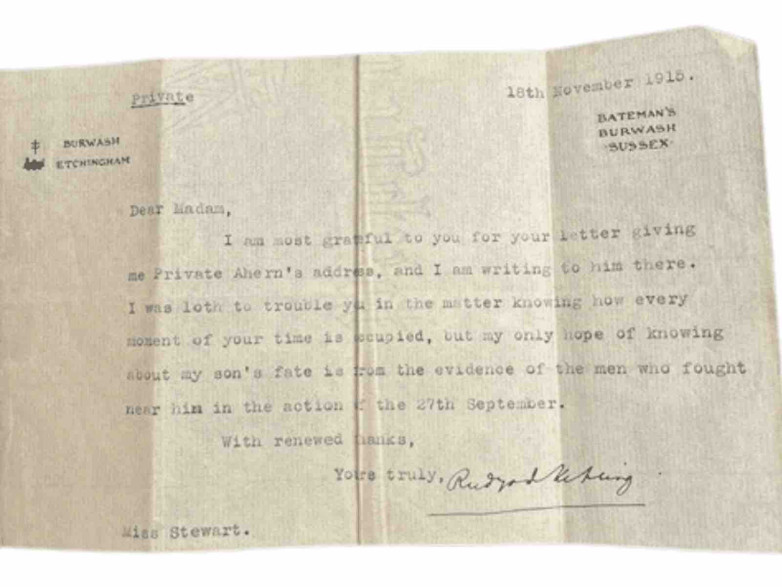 Part of this correspondence comes to auction at Hansons on October 10 with Rudyard Kipling's signed letter written from the family home of Bateman’s in Sussex and dated November 15t, 1915. It is addressed to the matron of the City of London Military Hospital and asks if one of her patients, Private Joseph Ahern of the Irish Guards who was wounded alongside his son, may have any information on his fate.