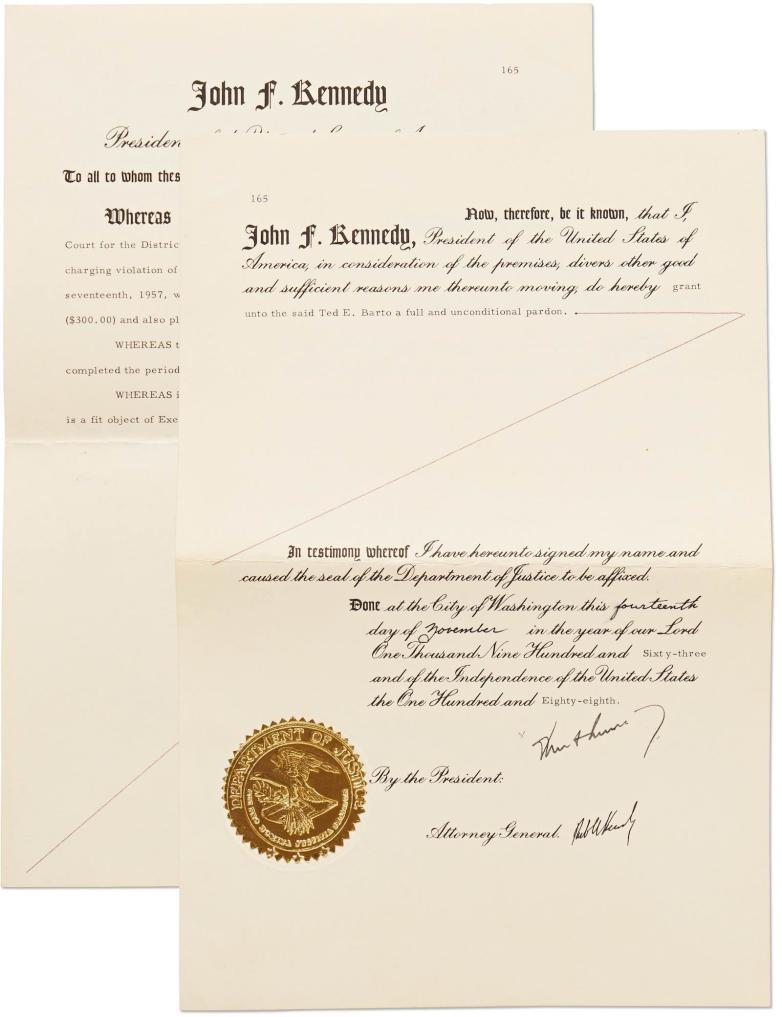 Consigned by the family of Ted Barto, the pardon has never before been offered at auction.